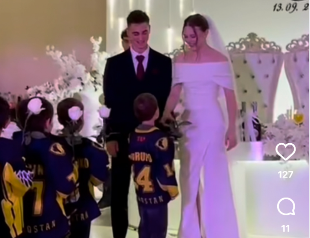 На свадьбе тренера детской хоккейной команды произошло то, что никто не ожидал — в зал один за другим вошли мальчишки в форме «Сарыарки», каждый с белой розой в руках. Цветы они дарили невесте, а та с улыбкой собирала букет из рук своих «маленьких спортсменов».